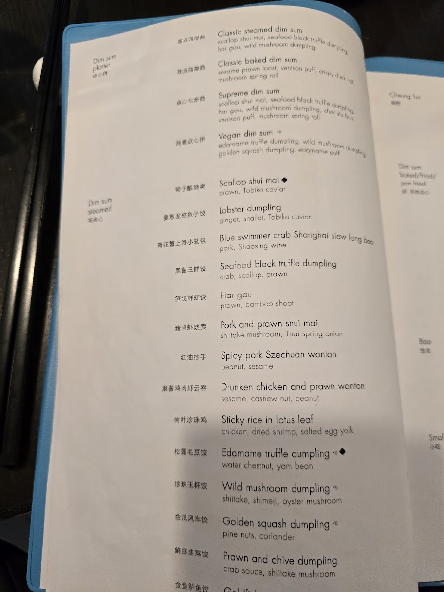 scallop shui mai, seafood black truffle dumpling, har gau, wild mushroom dumpling